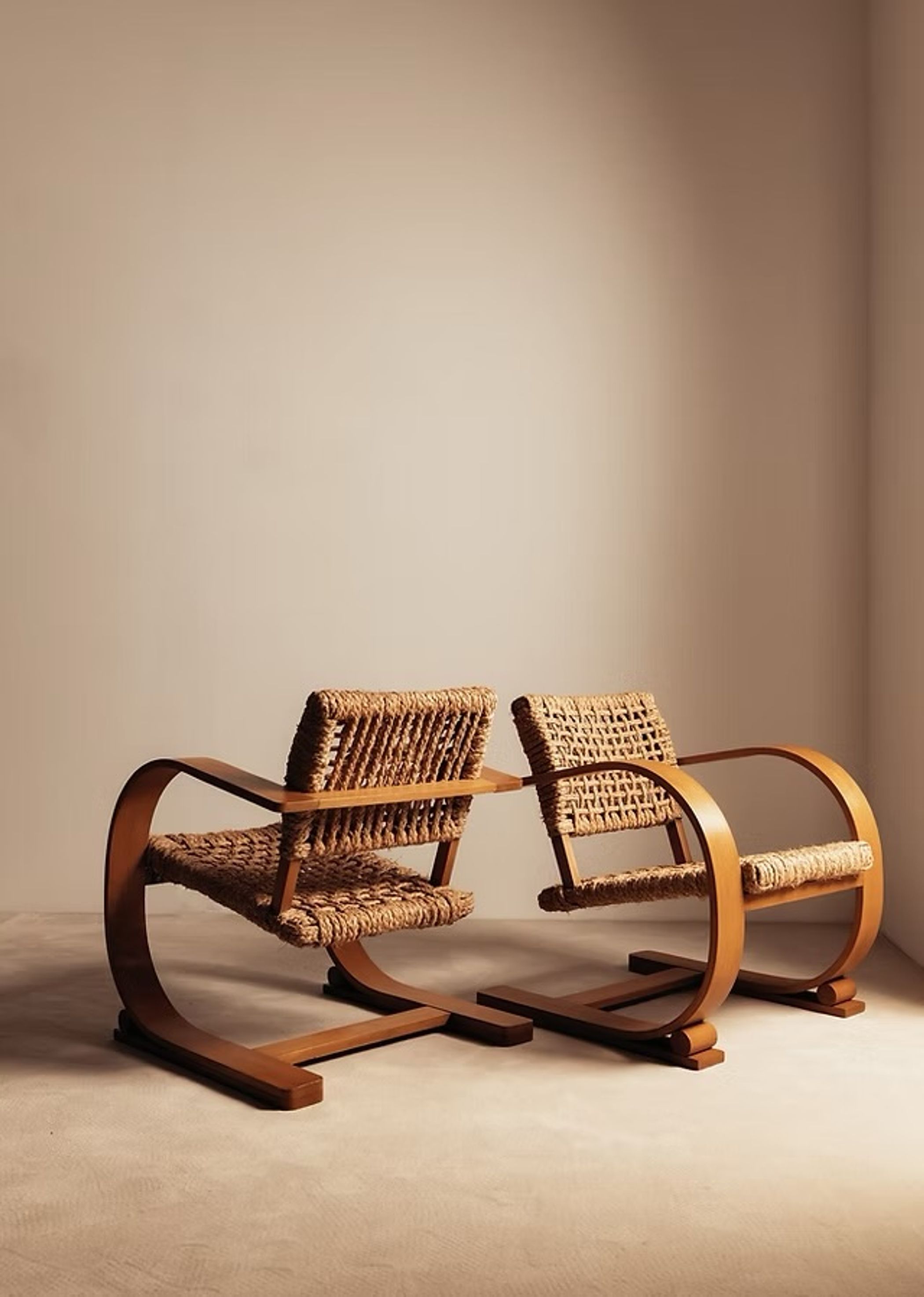 Pair of woven cord armchairs curved oak wood frame made in France 1940.
